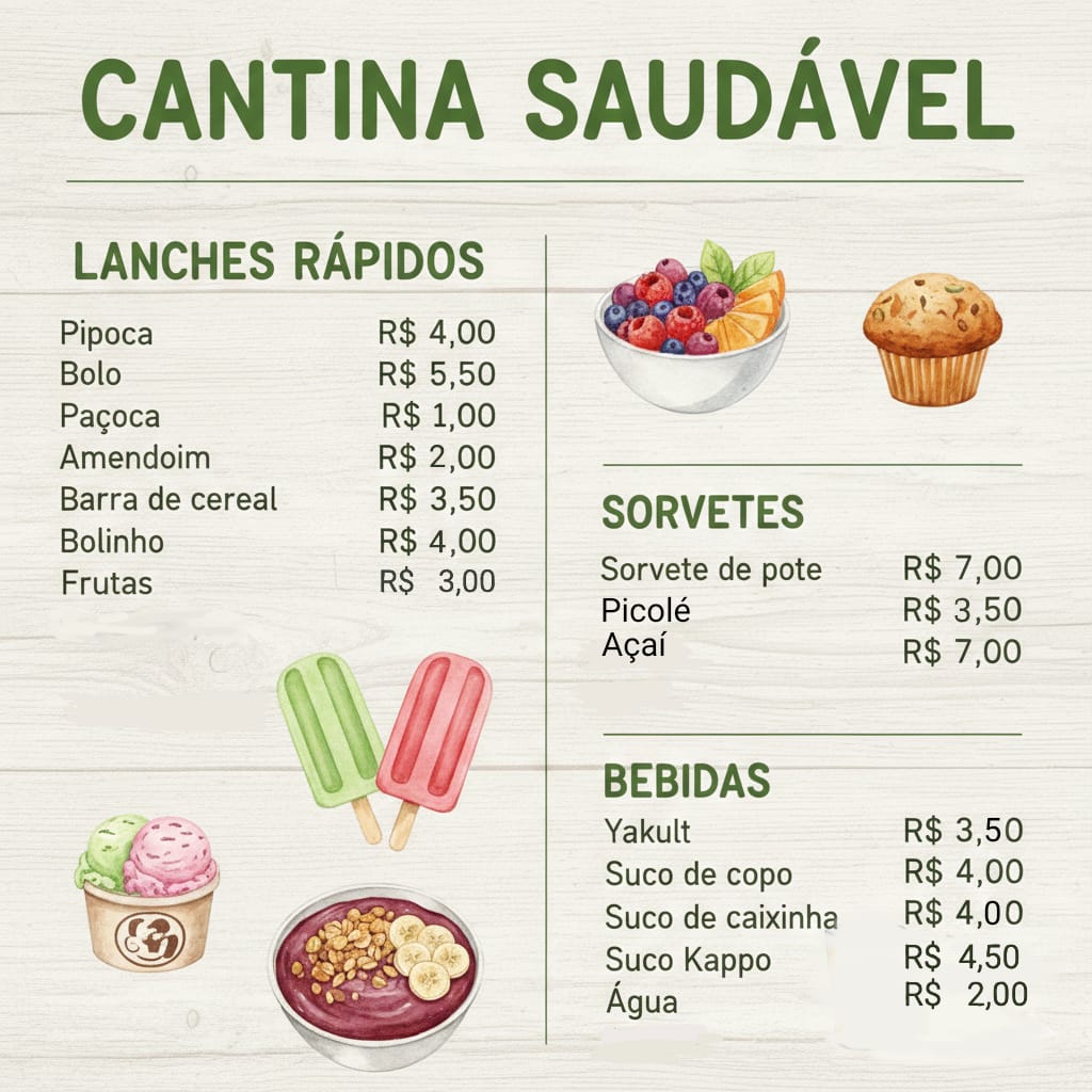 Confira abaixo o cardápio da nossa cantina: